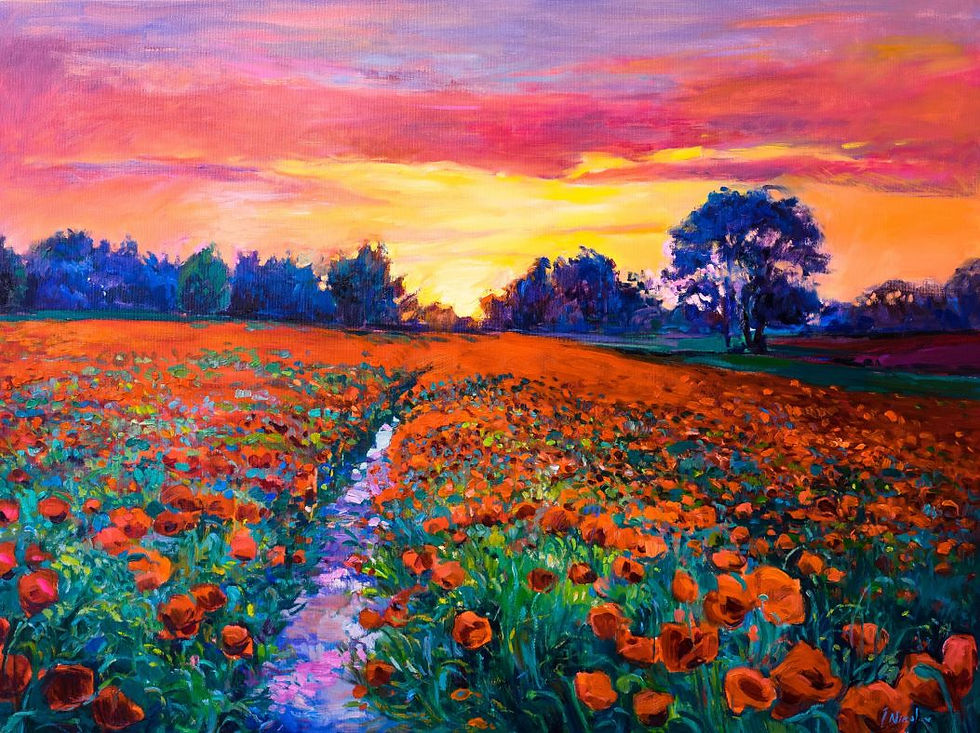 Red Poppies, Blue Trees in Yellow Light